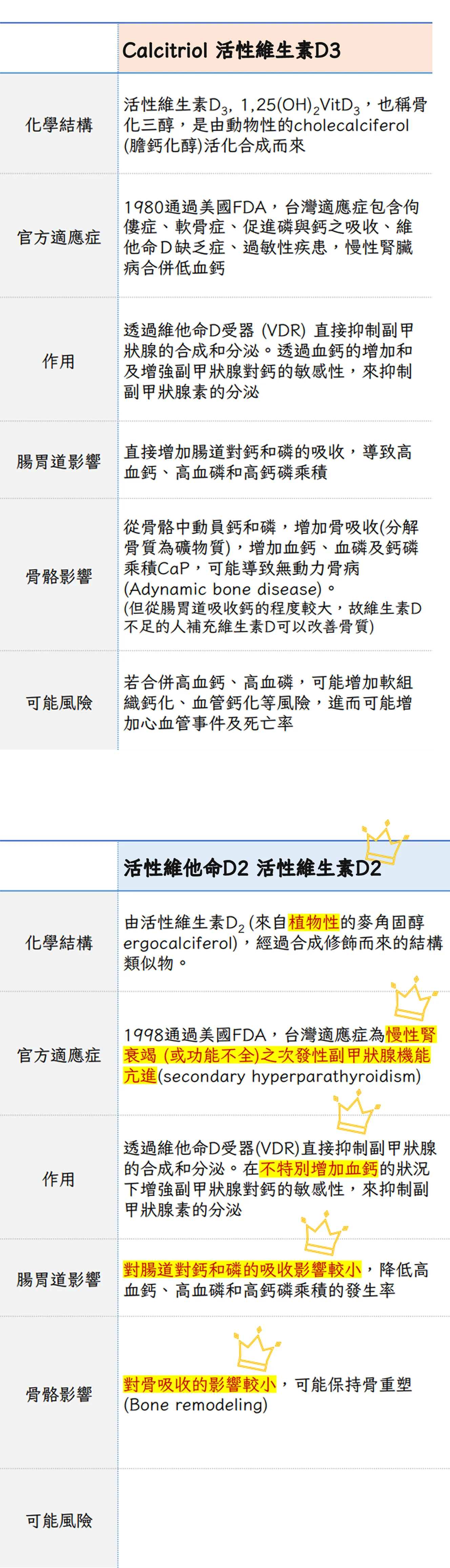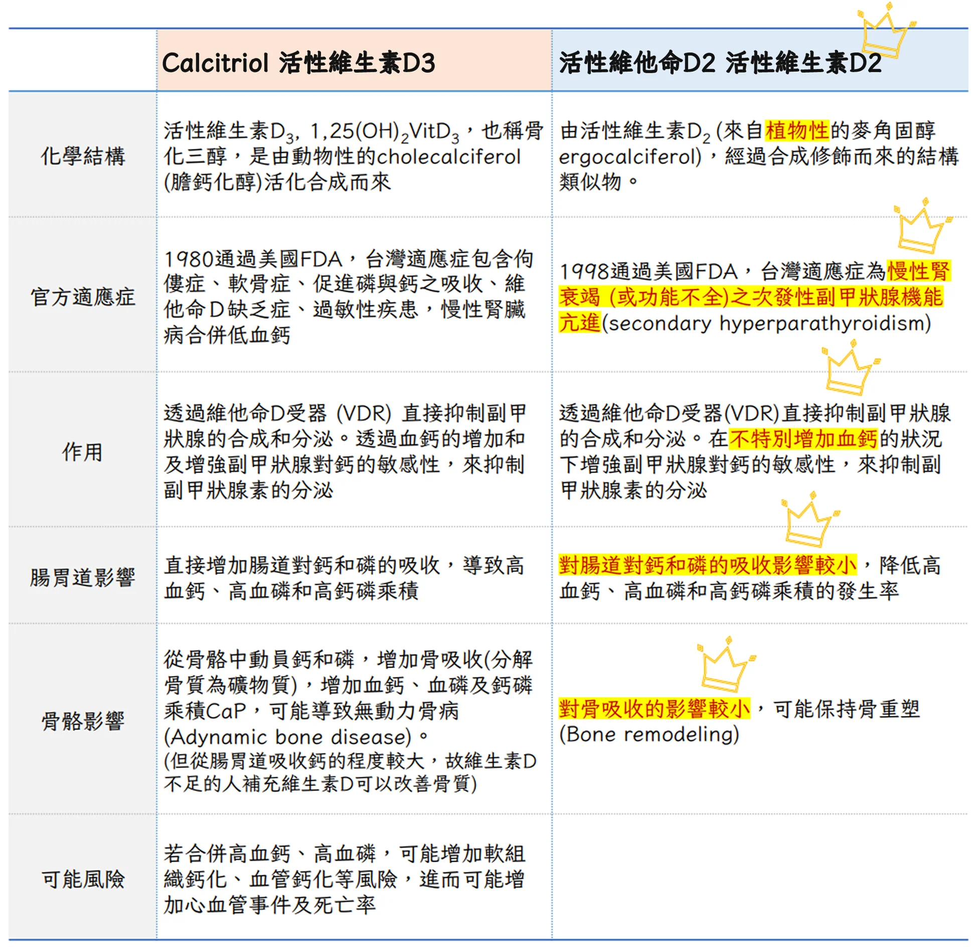 根據研究,新型維生素D2與傳統的維生素D3相比,更不容易導致高血鈣、高血磷,並減少後續的軟組織鈣化和血管鈣化風險。這對血管鈣化風險較一般人高很多的腎友來說是一項重大的優點。