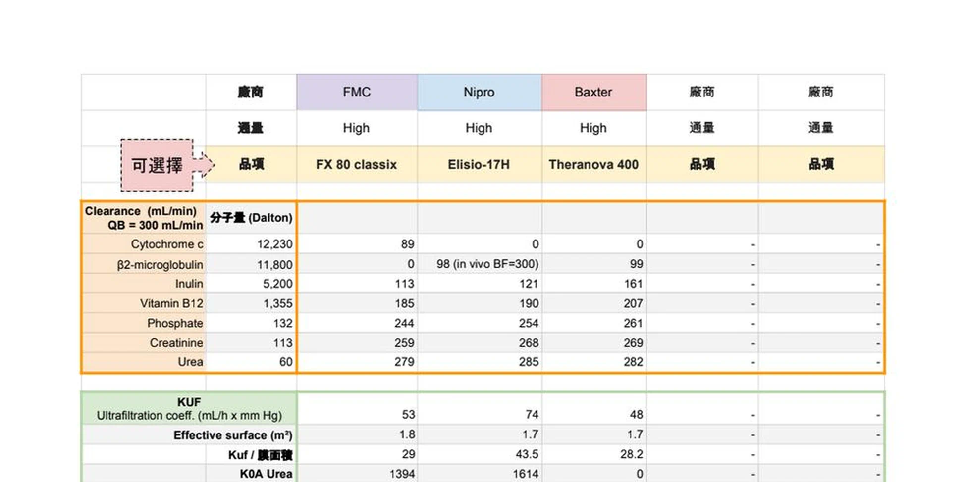各家人工腎臟(Artificial Kidney, AK, aka dialyzer)總整理